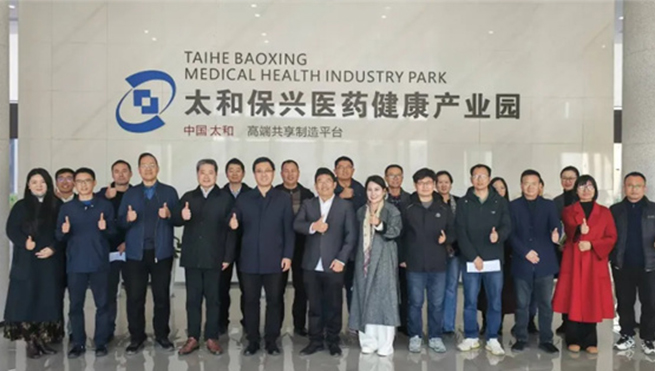 下午,考察团来到太和保兴医药健康产业园,保兴产业园执行总裁刘大勇向考察团详细介绍了“保兴模式”的运营理念与发展成效,进一步拓宽了大家对医药健康产业生态构建的认知视野。 在随后举办的座谈会上,省卫健委老龄健康处(健康产业促进处)四级调研员王斐、阜阳市卫健委党组成员、副主任季守龙、阜阳市卫健委三级调研员张文祥、太和县常委、副县长徐晨等政府代表出席交流。王斐处长在讲话中阐明了本次考察的目标和意义,提出要贯彻落实省领导工作要求,充分发挥协会桥梁作用,推动科研资源与产业需求精准对接,助力太和医药产业转型升级。季守龙主任代表阜阳市致欢迎辞。徐晨副县长系统介绍了太和县生物医药产业的发展现状与规划布局。金腾川教授则就本次考察的整体安排与愿景作了说明。副秘书长曹学平也对研究院及协会的基本情况与合作资源进行了推介。在交流环节中,考察团成员与太和当地生物医药企业代表围绕人才共享、科研协作、产业联动及项目合作等多个维度展开了热烈而深入的讨论,现场气氛活跃,并在多个领域达成了一系列合作意向。